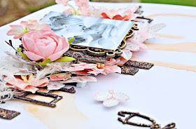 For my next page I went back to my traditional love of a white background and created my own watercolour background to blend with fussy cut pieces from the Amber & Apricot collection.